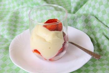 Milch und Sahne mischen. 4 El davon mit Puddingpulver und Zucker anrühren, den Rest zum Kochen bringen. Das Marzipan in der Milch unter Rühren auflösen. Wenn die Milch kocht das Puddingpulver dazugeben und einmal aufkochen lassen. Abkühlen, dabei ab und zu umrühren damit sich keine Haut bildet. Mit den Früchten in einem Glas servieren.