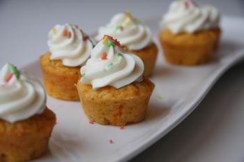 Den Frischkäse mit Puderzucker glatt rühren und in einen Spritzbeutel füllen. Nach dem Auskühlen auf jeden Muffin einen Tupfen spitzen. Mit Zuckerstreuseln garnieren.
