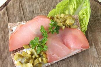 Brot mit Frischkäse bestreichen, Schinken darauf legen, die Gurke in feine Würfel schneiden und dazu legen, mit Petersilie und Salat anrichten.